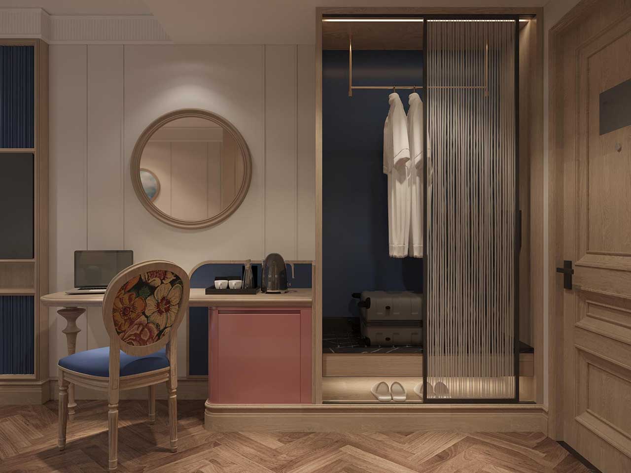 The President Room features a master bedroom with a luxurious king-size bed, a spacious balcony overlooking the city, and a walk-in closet. Guests can unwind in the elegant bathroom with a standing shower and bathtub combination, while a comfortable armchair and dedicated working area provide both relaxation and convenience.